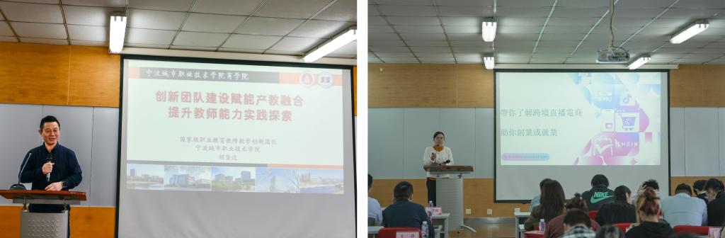 仪式结束后,宁波城市职业技术学院商学院院长胡坚达和浙江纺织服装职业技术学院商学院院长张芝萍分别带来了《创新团队建设赋能产教融合提升教师能力实践》和《跨境直播发展趋势》的专题讲座,分享了产教融合的成功案例和实践经验,为与会者提供了宝贵的启示。