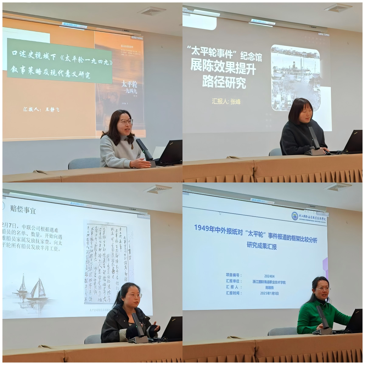 在理论研究专项课题成果交流环节,我校科研与合作处张峰、海洋旅游学院虞超雁、现代港口贸易学院陈颖燕、海洋装备工程学院王静飞等四位老师,分别围绕“太平轮事件”展陈纪念馆展陈效果提升、上海档案馆馆藏“太平轮事件”相关档案整理与研究、口述史视域下《太平轮一九四九》叙事策略及现代意义、“太平轮事件”中外新闻报道等四个主题汇报了研究成果。四位老师的研究课题以问题为导向,视角多元、内容多维、成果多样,获得了与会领导、专家的高度评价和一致认可,为推动“太平轮事件”研究的纵向深入、横向覆盖,进一步凝聚两岸血肉亲情、加强两岸文化交流贡献了“海运力量”。