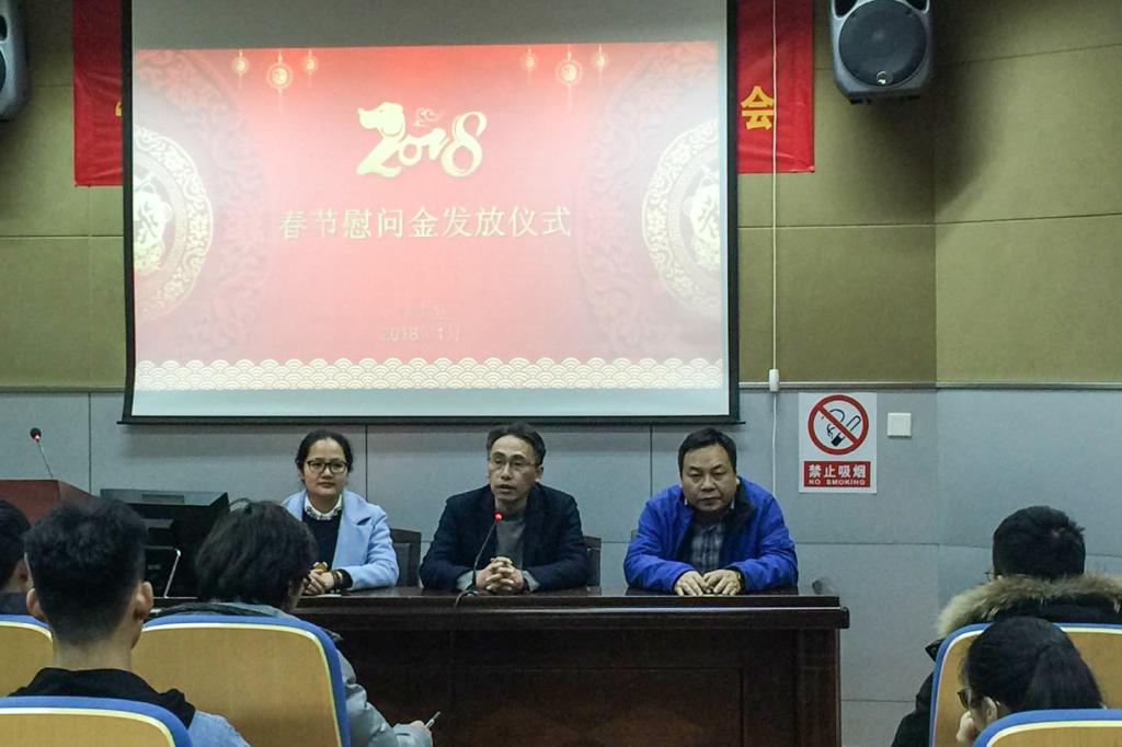 1月17日,学校2018年春节慰问金发放仪式在船舶实训楼万邦厅举行,127名困难学生获得学校发放的慰问金。