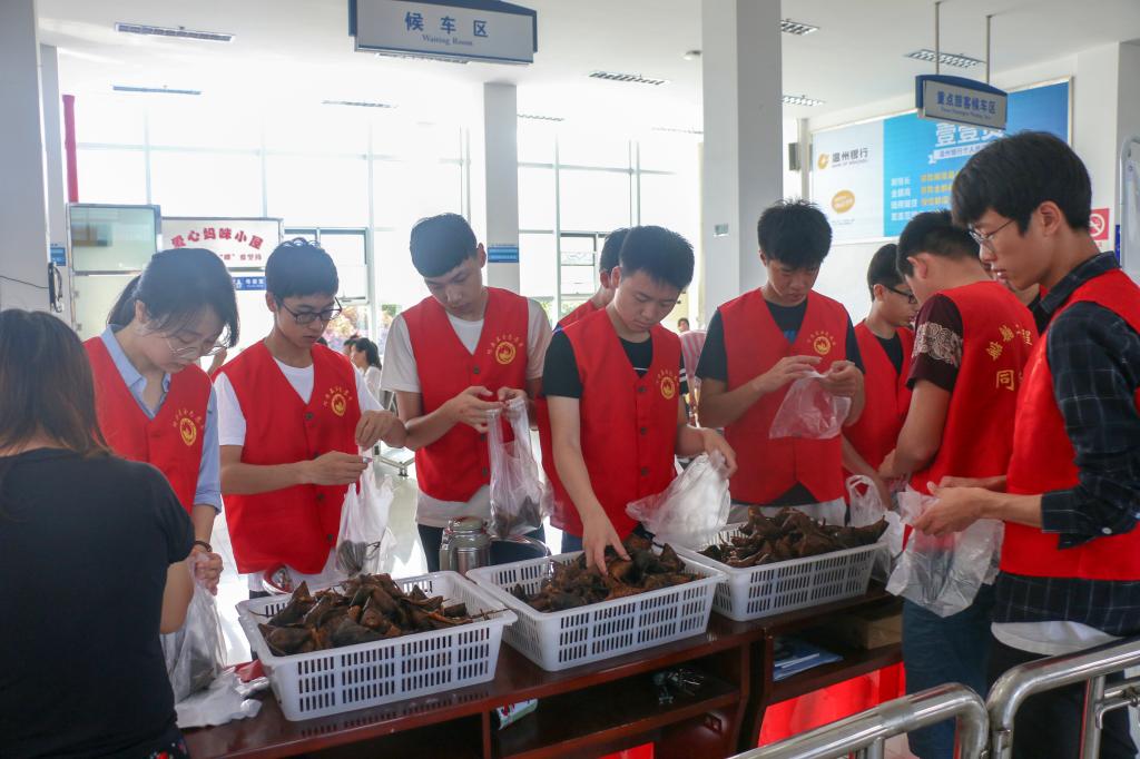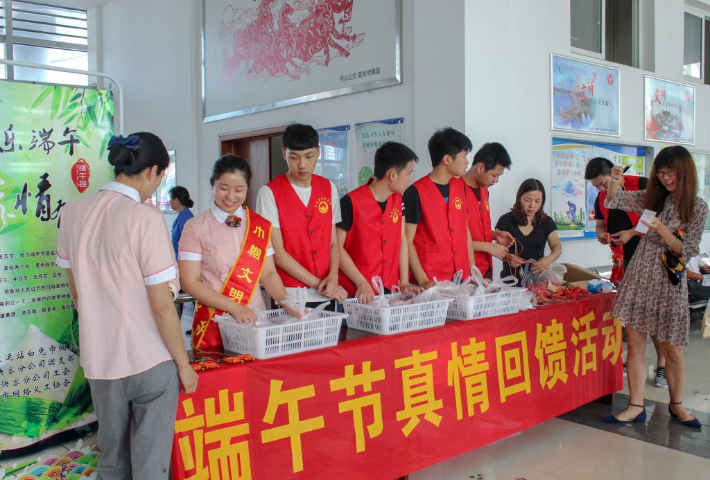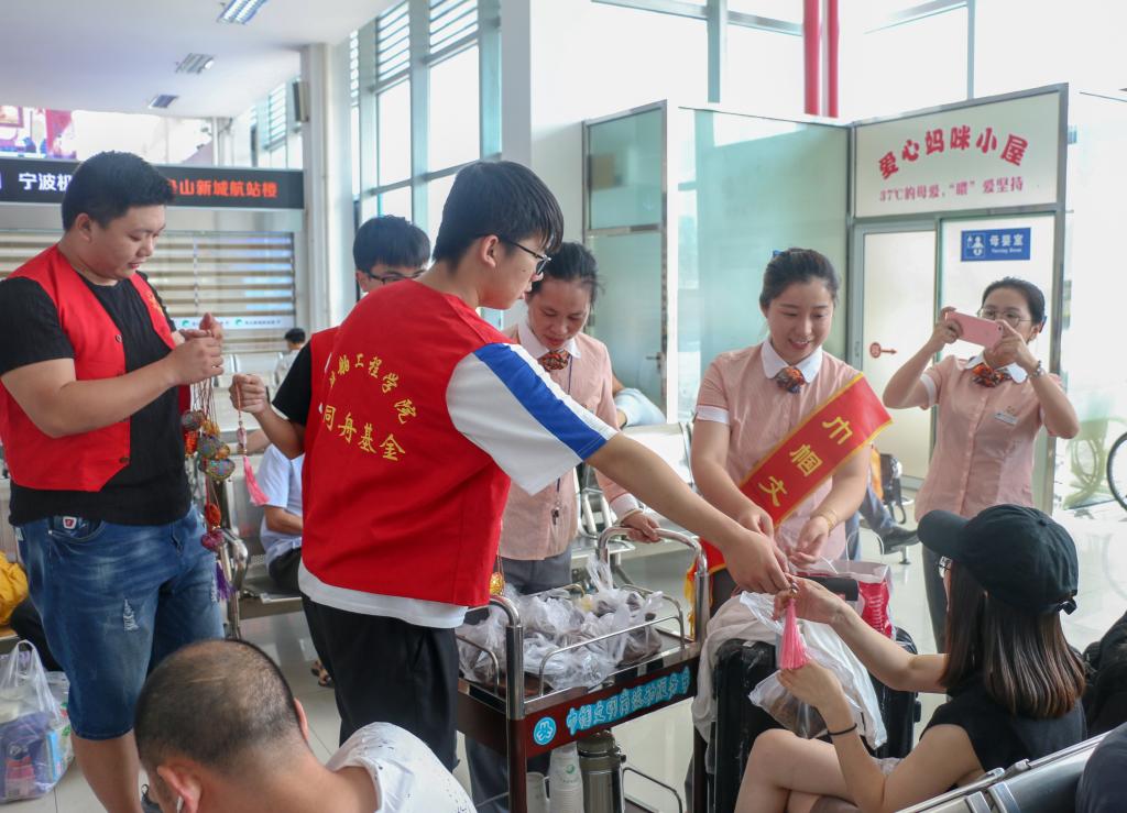 6月18日上午,同舟基金的10名志愿者在学院党员志愿者的带领下,与舟山市网络义工协会一起,在新城客运总站、定海客运中心和盐仓海丰码头同时将260只热腾腾的粽子和象征吉祥的福袋、五彩手环分发到旅客手中,祝愿端午安康。