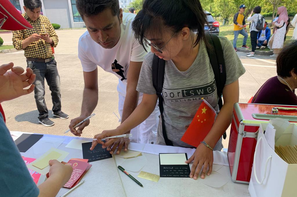 船舶工程学院红十字分会的志愿者们在校园开放日活动现场设置了感恩母亲,书写贺卡活动,吸引了众多市民参与,还不会写字的孩子们更是用绘画的方式表达对母亲的爱,外国的友人也在卡片上写下了对远方母亲的感恩之情。