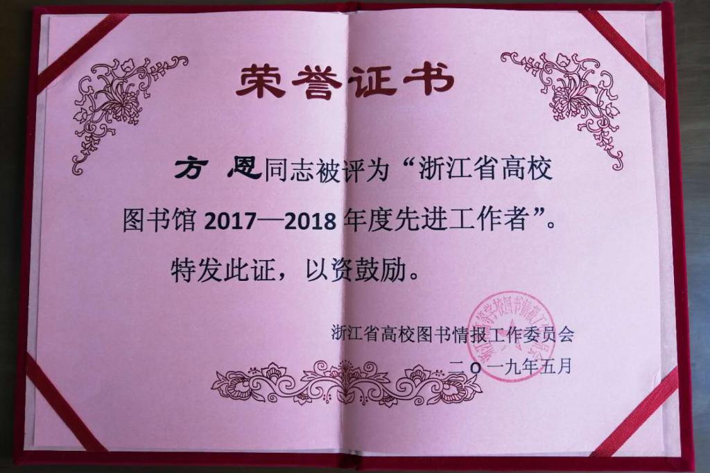 图书馆方恩老师荣获 “浙江省高校图书馆2017-2018年度先进工作者” 荣誉称号
