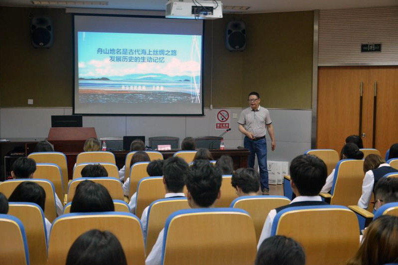 赠书仪式结束后,全国优秀社会科学普及专家、民政行业领军人物王建富作《舟山地名是古代海上丝绸之路发展历史的生动记忆》讲座,介绍舟山海洋开发历史和海洋民俗对舟山地名的影响,并通过特定地名的解读,探究舟山群岛的海洋文化特征和人文精神。