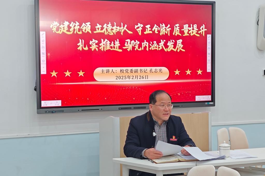 2月26日,马克思主义学院党支部在图书馆二楼思政智慧教室召开党员大会。会议由马克思主义学院党支部书记胡明扬主持。校党委副书记孔志光为全体党员讲授《党建统领 立德树人 守正创新 质量提升——扎实推进马院内涵式发展》专题党课。
