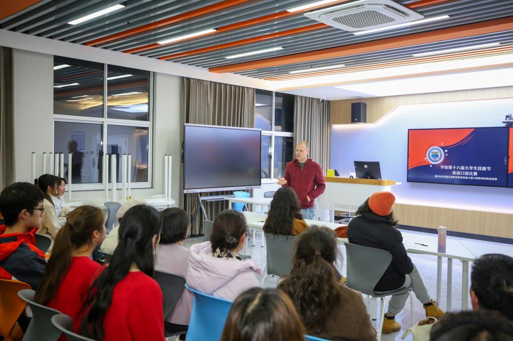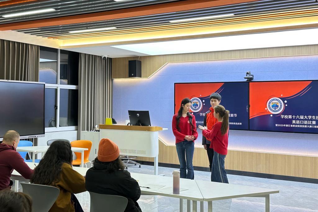 38日,校第十六届职业技能大赛英语口语比赛暨2025年浙江省职业院校技能大赛口语赛项校级选拔赛在4122教室举行,共有12支跨学院团队同台竞技。