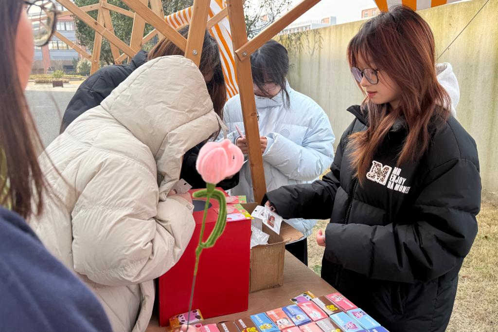 院团委学生会以及平安守护联盟社团成员花费两天时间用扭扭棒精心制作了数百朵精美手工花,女生们纷纷在便签上写下对女生的祝福、自我鼓励以及对未来的期许,随后前往奖品处领取手工花和可爱小礼品。一张张普通便签,承载着女性的爱与善良。