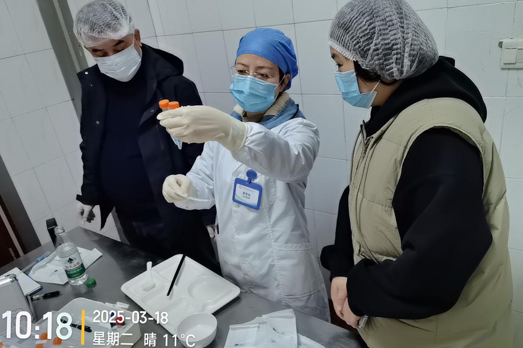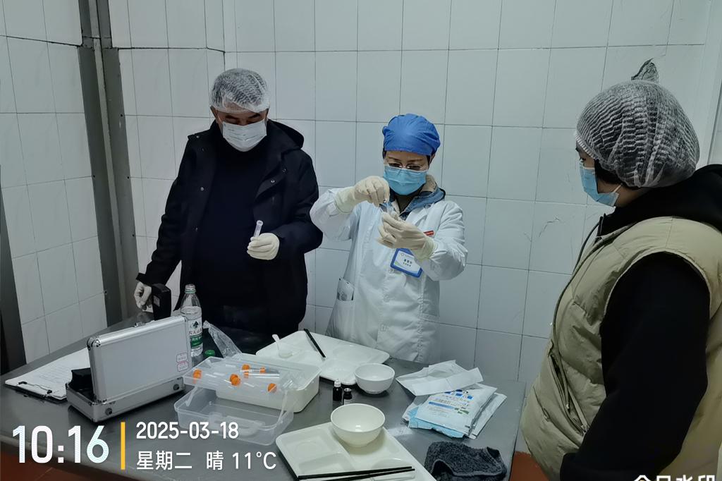 检查小组首先深入学生食堂后厨,对冰箱内熟食品、半成品是否加盖或用保鲜膜覆盖等食材储存区域进行了严格查看,确保各类食材分类放置、避免交叉污染;对碗筷进行洗涤剂残留专项检测,随机抽查碗筷进行抽样核验,确认其符合餐饮具洗涤剂残留标准,同时对消毒后的餐盘、碗筷、汤勺进行ATP洁净度检测(通过生物荧光反应快速评估细菌残留量)。检测结果显示,餐具表面洁净度数值均低于合格阈值,符合卫生标准。通过引入专业检测设备检查,确保餐饮具“一冲二洗三消毒”操作规范执行到位。
