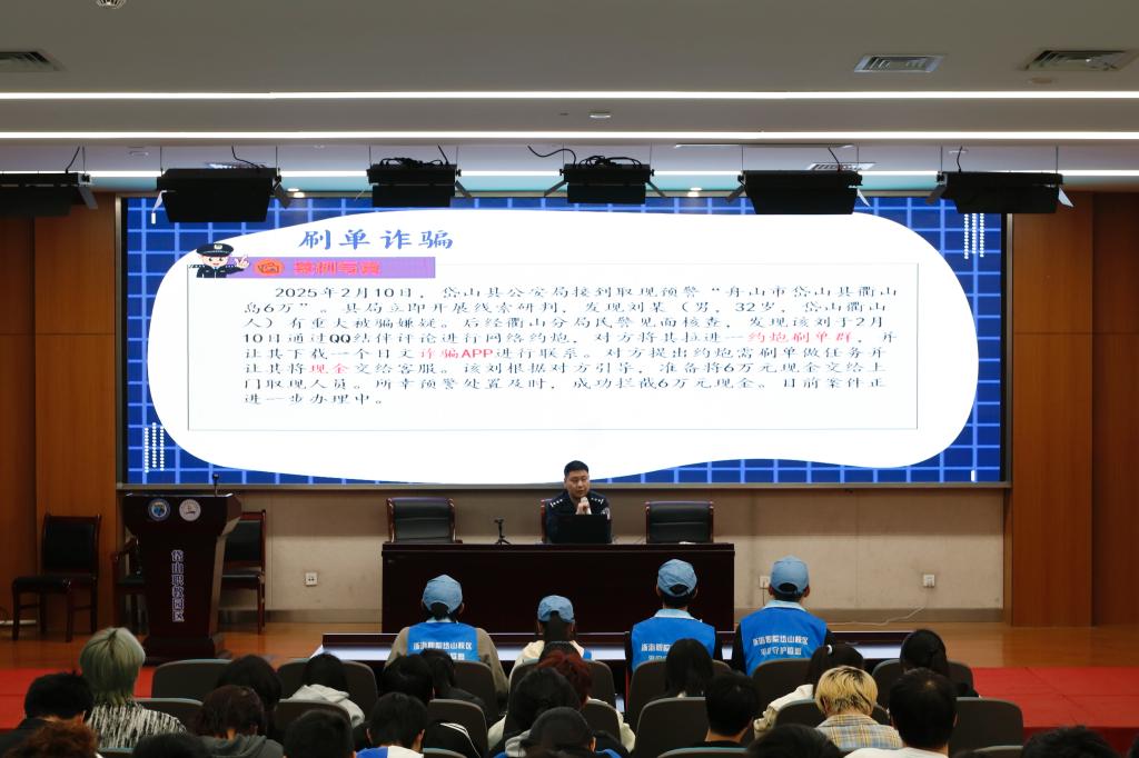 讲座现场,李警官以“守护青春财富,远离诈骗陷阱”为切入点,结合岱山校区内发生的真实案例,为师生们揭开电信网络诈骗的“神秘面纱”。他深入浅出地分析各类诈骗手段的特点与作案方式,让在场师生对诈骗手段有了更清晰的认识。