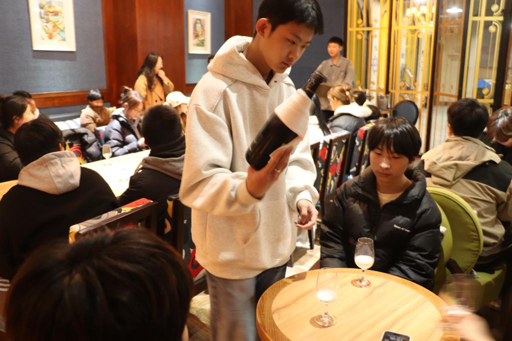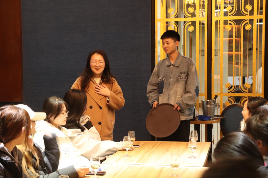 活动现场,社团技术骨干林君豪以专业演示诠释起泡酒开瓶的艺术。他强调“安全与优雅并重”的原则:松解铁丝后,左手拇指抵住软木塞,右手缓慢旋转瓶身,待气压推动下,木塞以“嘶——”的轻响与瓶口形成气孔缓缓滑出。“这声叹息是侍酒师与酒液的第一次对话”,林君豪的生动比喻赢得全场掌声。
