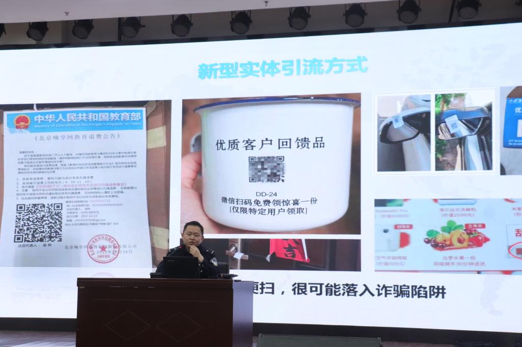 王警官结合工作中发生的典型电信诈骗案例,通过视频、图片等向同学们详细讲解了冒充熟人诈骗、虚假网络游戏交易、虚假购物、兼职刷单、投资理财、冒充身份等针对学生群体高发的诈骗类型,通过真实的案例展示了诈骗分子精心设计的陷阱,提醒学生要警惕提醒同学们陌生链接不轻易点击、个人信息不透露、转账汇款多核实。