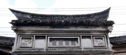 叶至才现在居住的老宅院,是他爷爷手里造起来的。老宅坐东北朝西南,现存一座台墙门和五间正屋,老宅里的石条、石板,明显比涨次其他人家用得多、用得好。叶家的台墙门上下两道屋脊,清水脊翼。墙门用淡粉色石条构筑门框,其正面石门框上坊先用灰塑构画一幅吉祥纹饰,两头隐约可见是飘逸的飞龙图样。中坊是五个大小不一的镜框式装饰,四周衬有卷草纹图饰,中间长方形镜框有三个图样组成,其中间原有太极八卦,两边灰塑花枝还在。中坊两侧镜框是两幅灰塑的太阳图案,墙门屋檐底下是隐含“白璧无瑕”之义的五个长方形灰塑。墙门朝正屋一面装饰层次与正面相同,其中中坊也是镜框式,只不过装饰图文有点不同,最中间原有“瑞气生祥”四字砖雕,石门框上面两边原还有一对小石狮子,可惜这些都在上世纪六十年代因为一些历史原因被敲掉了。