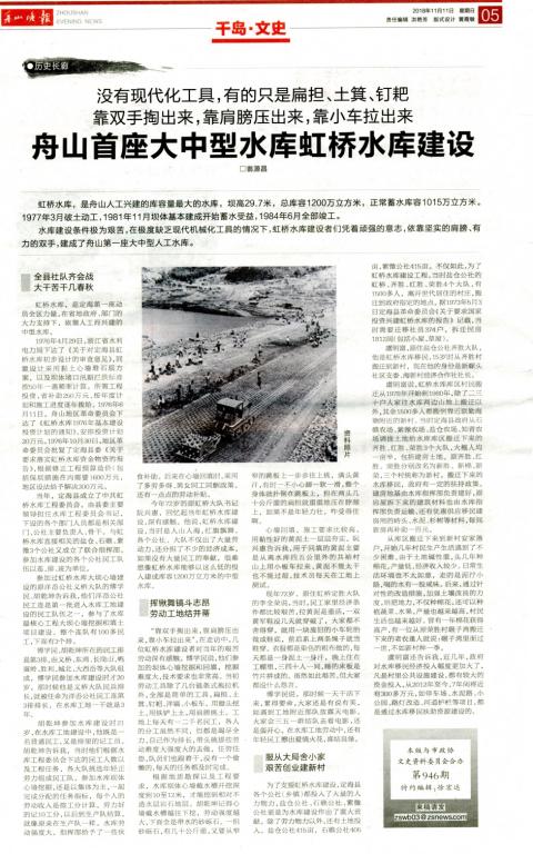 水库建设条件极为艰苦,在极度缺乏现代机械化工具的情况下,虹桥水库建设者们凭着顽强的意志,依靠坚实的肩膀、有力的双手,建成了舟山第一座大中型人工水库。
