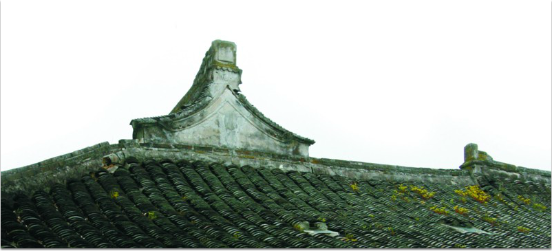 二是传统民居屋脊顶端垛头的印斗式构建。舟山传统民居屋脊两端垛头,安装的“座头”, 形式上主要有“鹊尾式”“印斗式”两种。定海、普陀两地以“鹊尾式”为主,而石马岙所保存的几幢传统民居中,屋脊两端垛头上的“座头”,却是定海、普陀两地少见的“印斗式”,即在垛头最前面安置一块有“田”字纹的形似方斗之砖,这让人有不少的想象空间。“印斗式”样式通常有房屋主人希望子孙后代致力于耕读传家、从而进朝为仕之意愿,石马岙於家历史上出过不少科举人才,勤于读书是於氏家族绵延流传的一种家风。