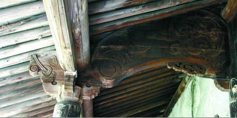 三是传统民居中的象首纹挑尖梁头。挑尖梁是连接金柱和檐柱的梁,形状虽然较为短小,因其处于前檐之下,是一个比较显眼的木构件,故梁头大多做得比较复杂,多刻吉祥图纹,定海等地传统民居挑尖梁头多以狮首形状来装饰,而石马岙传统民居中挑尖梁头除了狮首等民间常用的装饰图纹以外,还有一种是象首纹,象头上还饰有象征绳索挽成的笼头,在海岛传统民居中,这也是少见的一种装饰图纹。