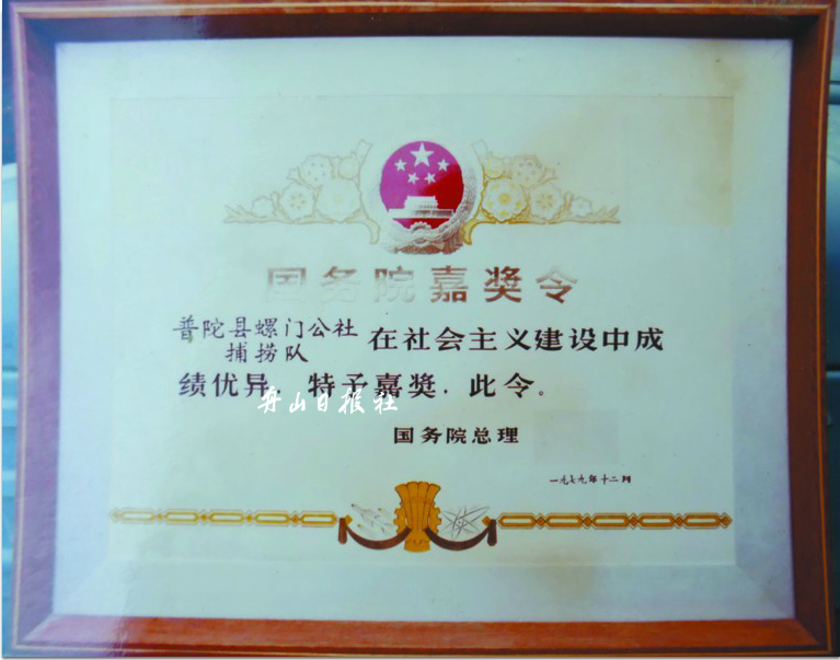 一个世代捕鱼为生的普通渔民在雄伟的人民大会堂受到党和国家领导人借鉴,并合影留念,史悠辉老人至今还是激动不已,他还精心保管着那张国务院嘉奖令照片,嘉奖令上写看“普陀县螺门公社捕捞队在社会主义建设中成绩优异,特予嘉奖,此令”。这是螺门至今众多集体荣誉中最高的荣誉一一全国渔业先进单位。当年,授予全国先进单位称号的只有351个,而地处偏僻的渔村螺门竟能获得这一殊荣,实在不易。