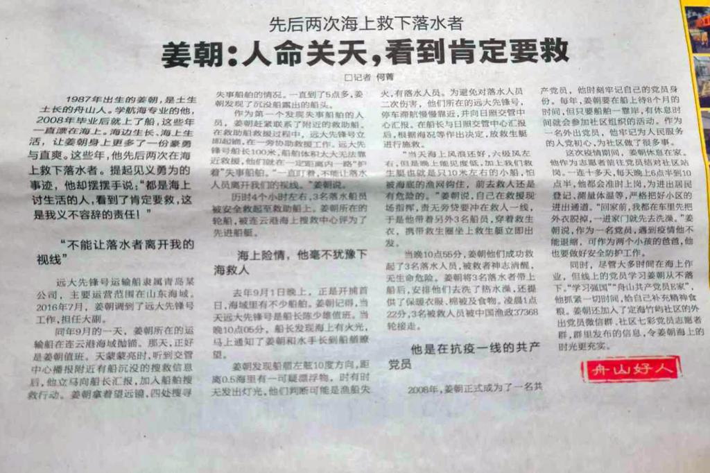 《舟山晚报》:先后两次海上救下落水者 舟山好人姜朝:人命关天,看到肯定要救