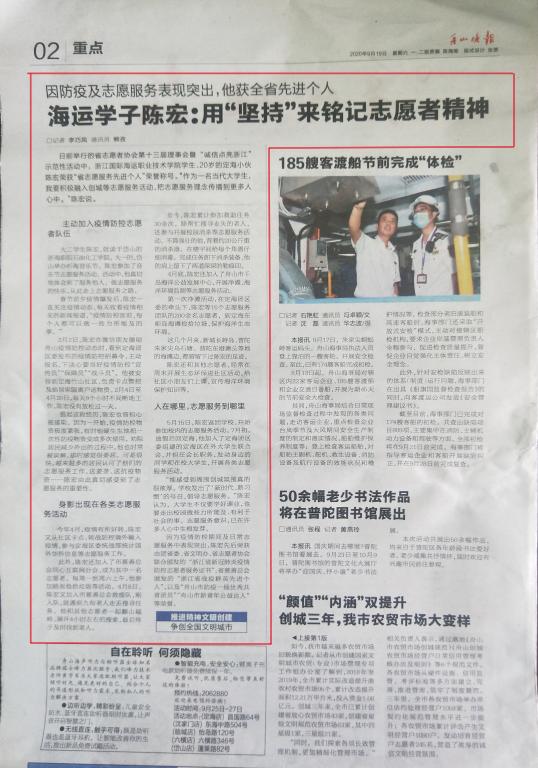 《舟山晚报》:推进精神文明创建|海运学子陈宏:用“坚持”来铭记志愿者精神