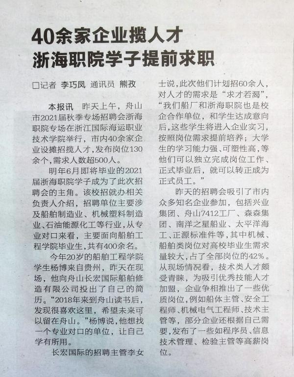 长宏国际的招聘主管李女士说,此次他们计划招60余人,对人才的需求是“求才若渴”,“我们船厂和浙海职院也是校企合作单位,和学生达成意向后,这些学生将进入企业实习,按照岗位需求提前培养;大学生的学习能力强、可塑性高,等他们可以独立完成岗位工作、正式毕业后,就可以转正成为正式员工。”