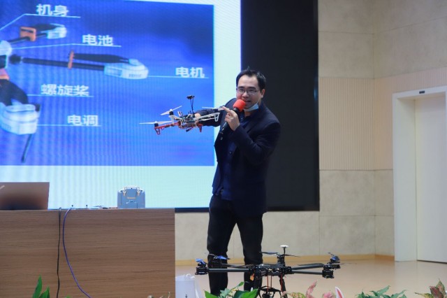 讲座中,卓宏明给学生们介绍了固定翼、旋翼等各种类型的无人机,并展示了无人机实物,让学生们近距离接触这些高科技产品,了解无人机在农业、气象、城市规划、5G巡检、疫情防护等多方面的实际运用。