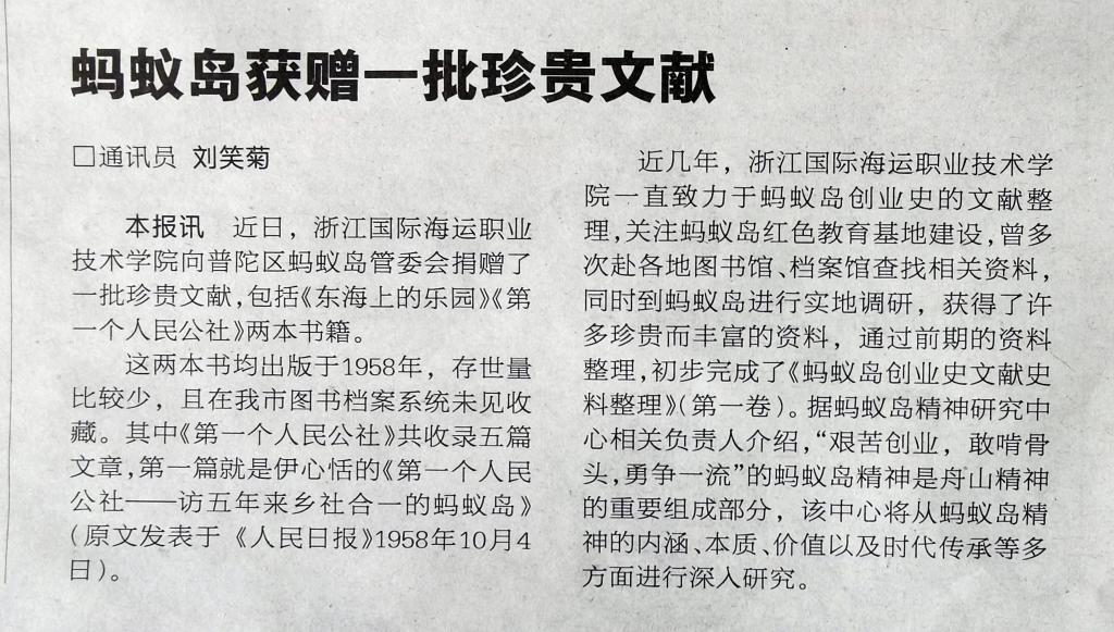 这两本书均出版于1958年,存世量比较少,且在我市图书档案系统未见收藏。其中《第一个人民公社》共收录五篇文章,第一篇就是伊心恬的《第一个人民公社—访五年来乡社合一的蚂蚁岛》(原文发表于《人民日报》1958年10月4日)。
