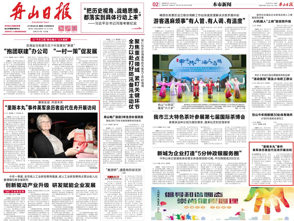 本报讯 5月20日起,参加东极渔民营救英俘纪念碑揭幕仪式的18位英军亲历者后代在舟开展访问。他们与东极渔民后代一同参与赠书仪式,并举行了“里斯本丸”纪念奖颁奖仪式,共同参观了东极“里斯本丸”营救事件纪念馆,进一步铭记情谊、赓续友谊。