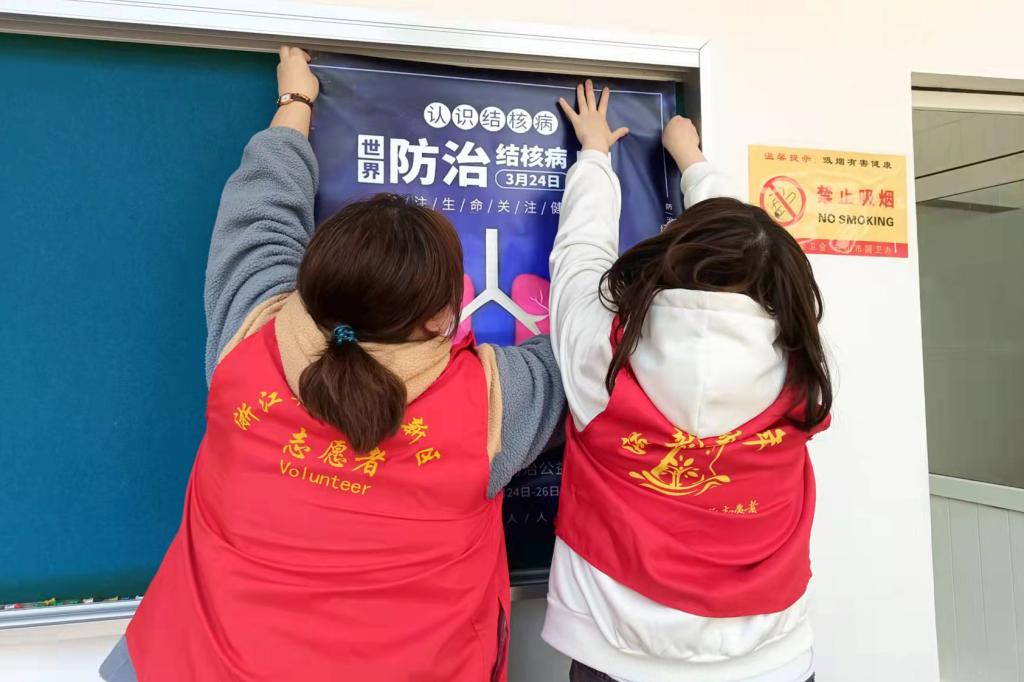 志愿者们通过张贴海报和悬挂横幅的形式向大家宣传普及了结核病的相关知识以及结核病的可疑症状、传染途径,切实提高了学生们的自我保护意识。