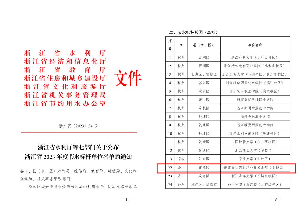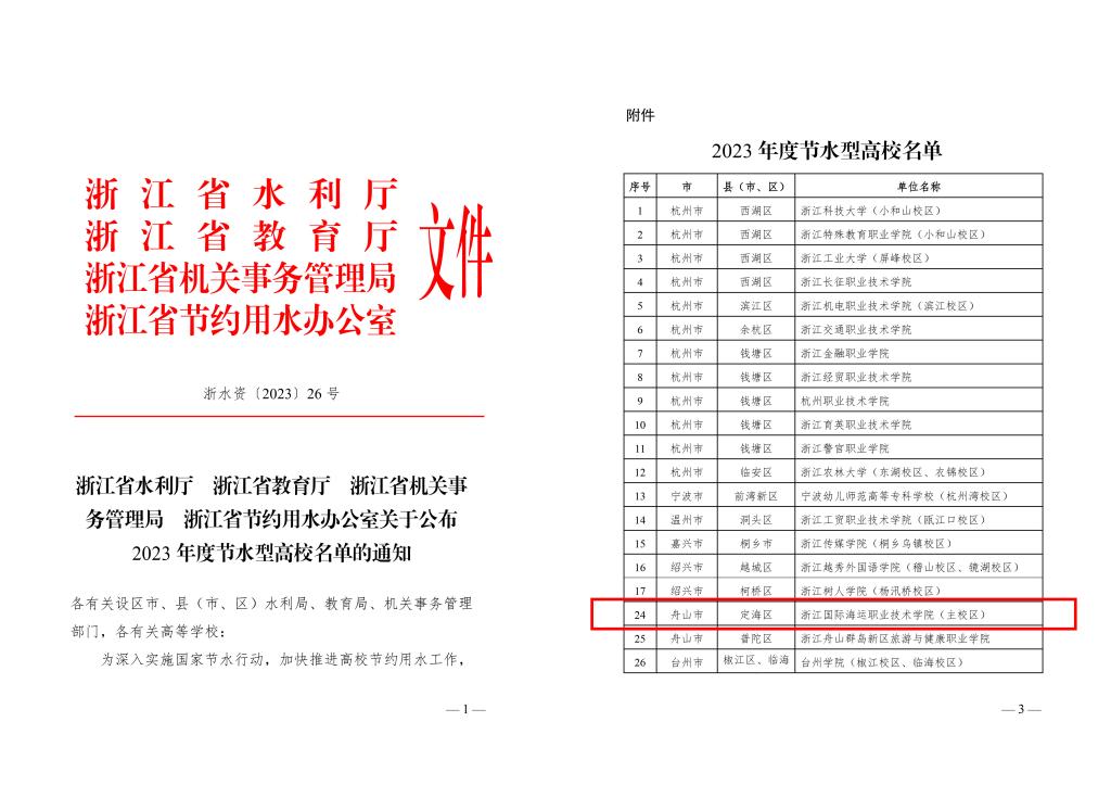 近日,浙江省水利厅、浙江省经济和信息化厅、浙江省教育厅等七部门联合公布了浙江省2023年度节水标杆单位名单,我校荣获“浙江省2023年度节水型标杆单位”荣誉称号。浙江省水利厅、浙江省教育厅、浙江省机关事务管理局、浙江省节约用水办公室联合公布了2023年度节水型高校名单,我校获评“浙江省2023年度节水型高校”荣誉称号。