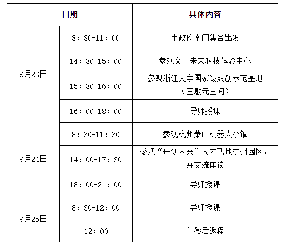 采取实地参观考察、现场教学、座谈交流、导师培训等多种形式,深入了解杭州在科技创业、产业创新、企业孵化等方面的成功经验。